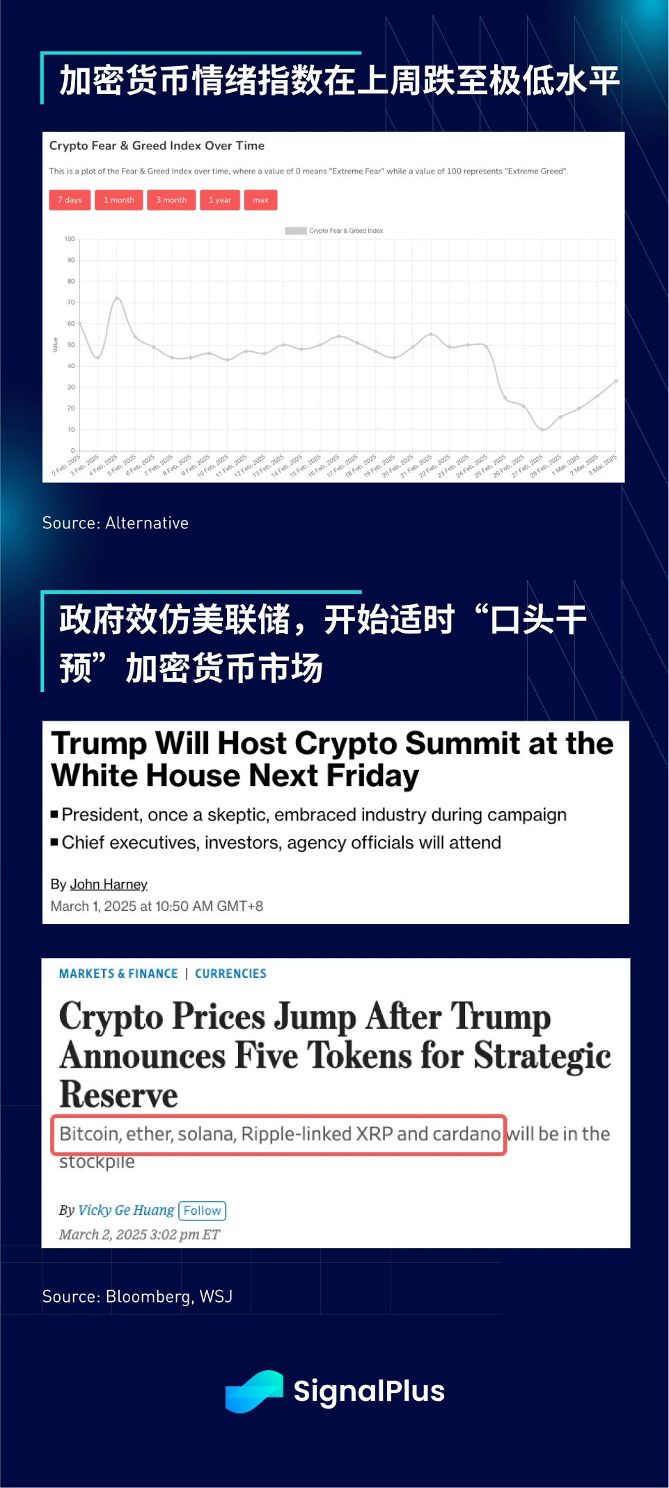 随著价格暴跌,市场情绪大幅恶化,上周五 Alternative 的 “Fear & Greed”指数跌至极端低点,随后 Trump 政府出手干预,带来了两大利好消息,宣布本周将于白宫举行“加密货币峰会”,并提出将 5 种代币纳入新的战略储备(BTC、ETH、SOL、XRP、ADA)。