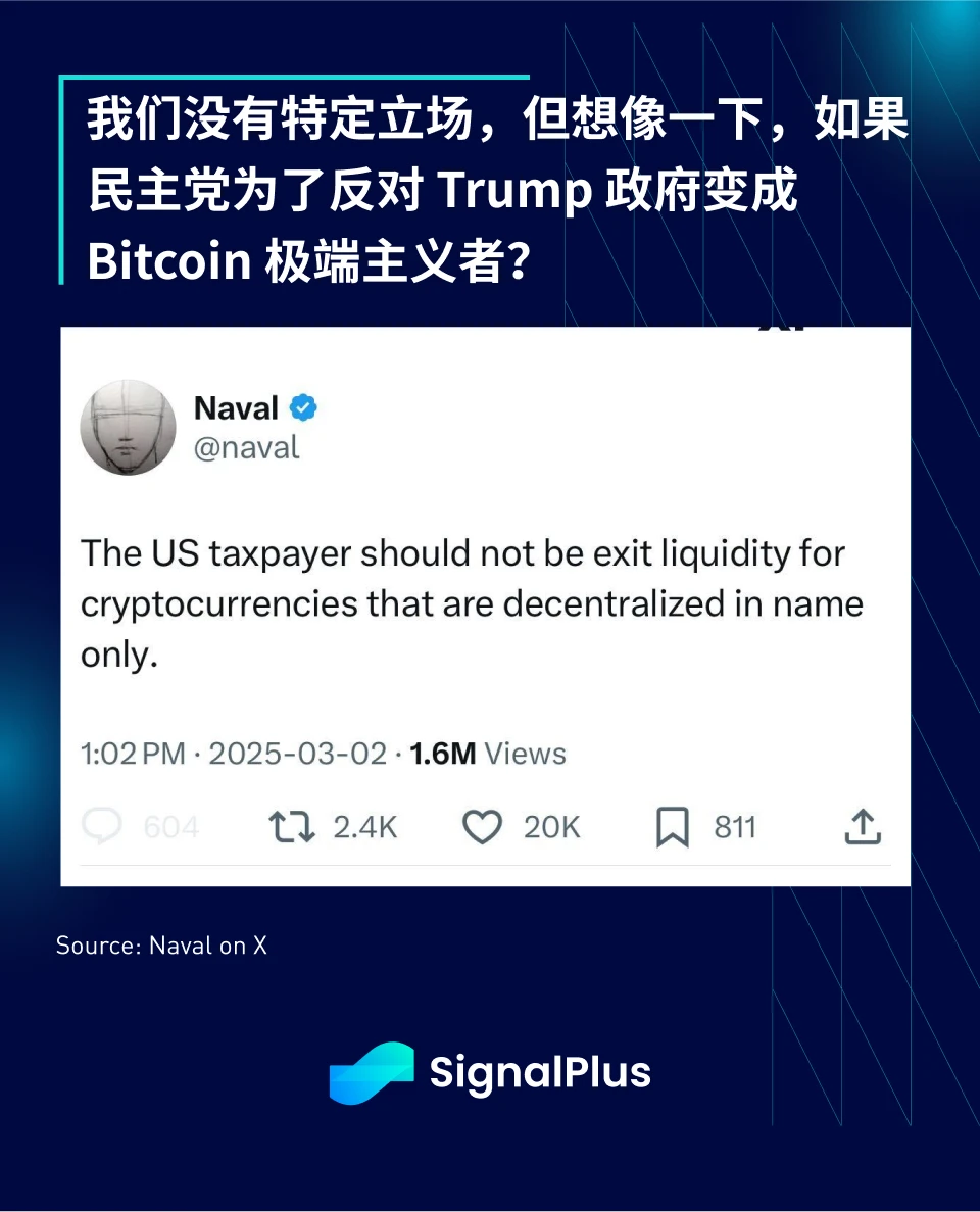 然而,“战略储备”的消息并未获得所有市场参与者的认可,去中心化的长期支持者和意见领袖(例如 Naval Ravikant)并不支持,预计关于储备资产构成的讨论和争议很可能会在未来一段时间内持续发酵。如果民主党为了反对 Trump 政府,最终选择拥抱 BTC 并成为 BTC 极端主义者,那将会是相当具有讽刺意味的情境。