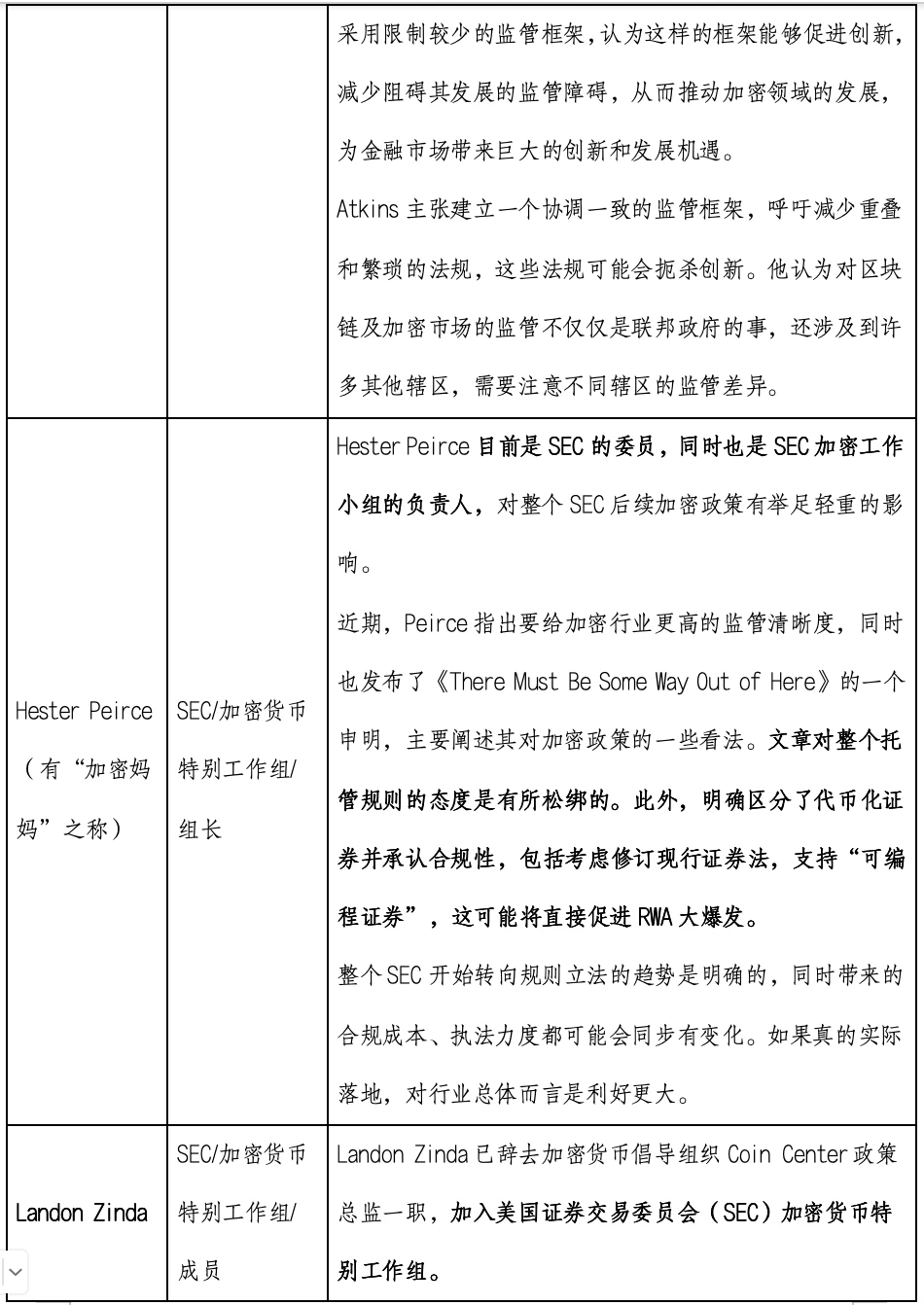 SEC 主席/保罗·阿特金斯(PaulAtkins) :曾任 SEC 委员,支持自由市场发展,减少监管干预。他的上任意味着 SEC 可能减少执法行动,促进市场自由发展。
