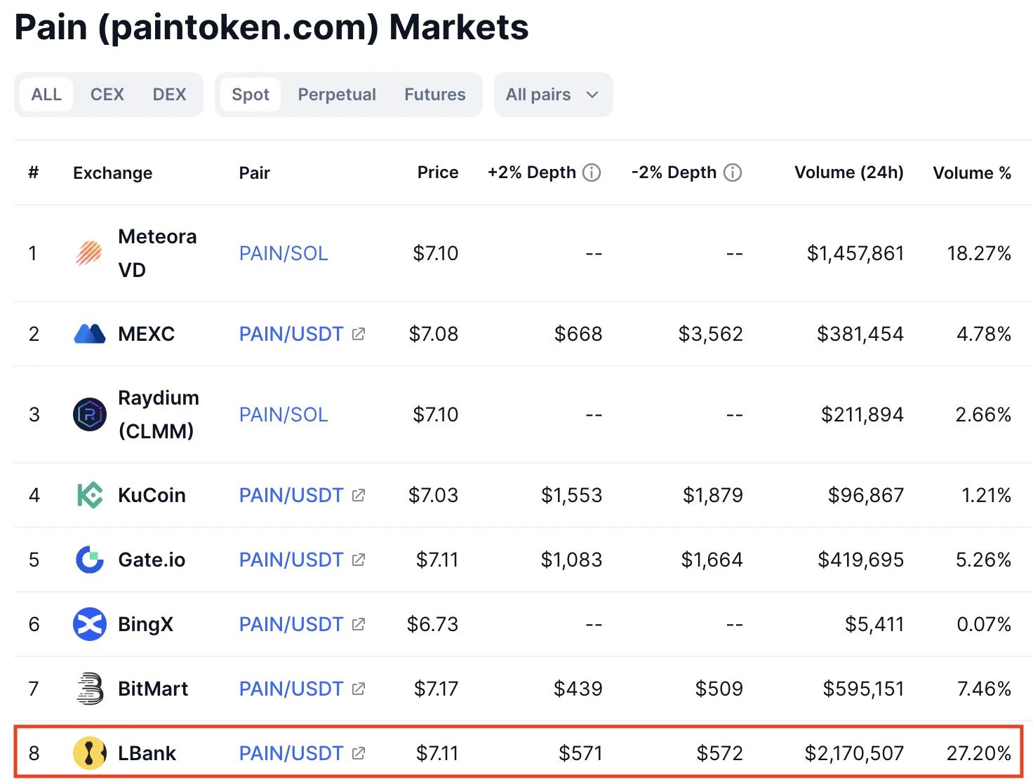 对 Meme 生态的深刻理解和长期布局,让 LBank 在这一快速发展的细分市场中占据领先地位。LBank 不仅为用户提供最具潜力的 Meme 币种选择,更重要的是确保每一笔交易都能以最优价格执行,真正做到”Meme 深度第一“。即使在市场波动较大的情况下,LBank Meme 交易的价格稳定性仍明显优于其他平台。近期 LBank 上线的 PAIN,交易市场占有率甚至超过 DEX,以 27.2% 排名第一。