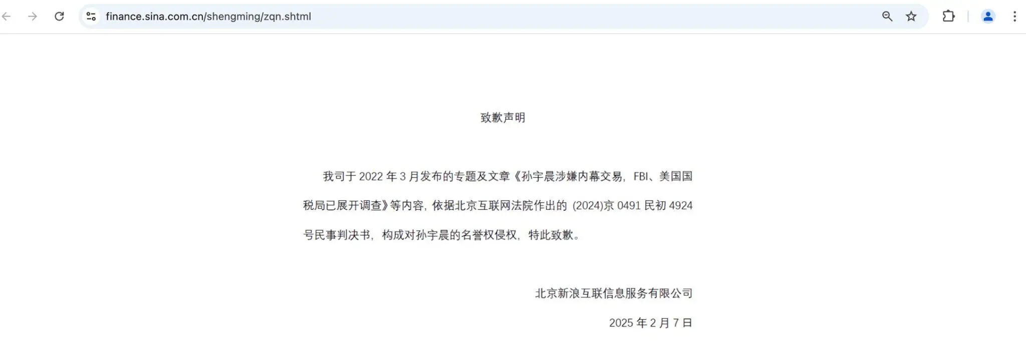 孙宇晨胜诉新浪:新浪公开道歉并删除侵权内容