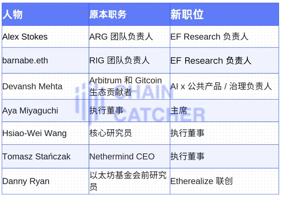 在所有调整中,最受关注的是以太坊基金会原执行董事 Aya Miyaguchi 晋升为主席,(相关阅读: 多方观点|换帅 Aya Miyaguchi,以太坊能否重拾市场信心? ),Hsiao-Wei Wang 和 Tomasz Stańczak 接任联合执行董事一职。