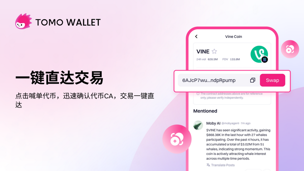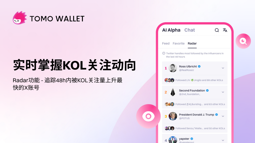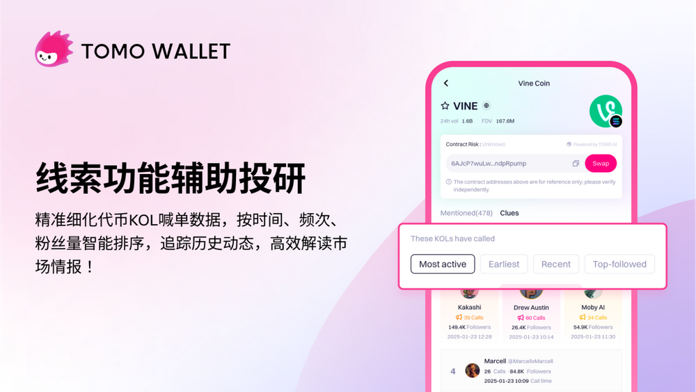你是否因熬夜刷KOL错失买点?跟单大V反被割?手动跨链兑换手速慢到拍断大腿? Tomo钱包 全新推出 AI Alpha功能 ,用AI狙击加密市场核心痛点,帮助用户高效追踪KOL动态、提前锁定百倍币、搭建KOL信任列表并实现一站式智能交易。