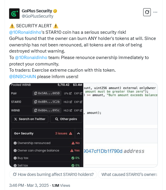 不过,在代币发行的过程中,人们似乎仍感受到$STAR10代币发行的不诚恳。据GoPlus Security监测,$STAR10代币的合约所有者仍保留销毁代币的权限,且资金池锁仓的时限只有一个月。