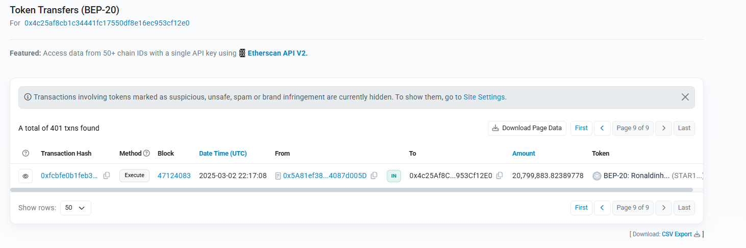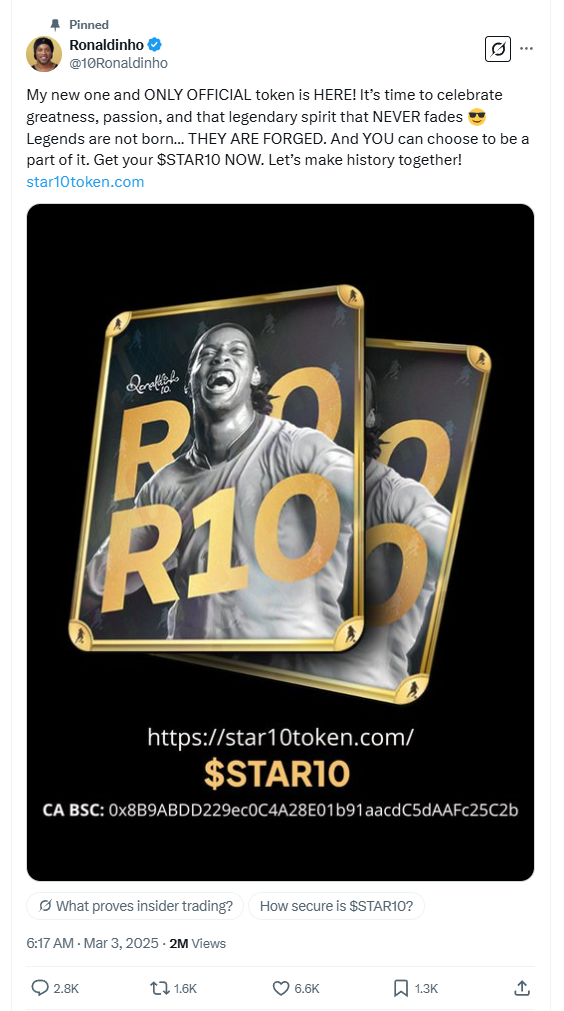 自特朗普之后,名人发币似乎已经成为一个新的生意经。3月2日,知名的退役足球巨星罗纳尔迪尼奥也宣布在BSC链上推出个人的代币$STAR10。市场低迷之下,尽管流通市值最高触及3200万美元,但距预期中的抢购盛况仍相去甚远。反而在社交媒体上暴露出不少关于这场代币的阴谋论调,深圳某发币团队,资金池未锁仓,铸币权限未丢弃,内部人士提前抢跑等丑闻消息接踵而来,连转发上线信息的币安创始人CZ也一度陷入用户的围攻。这场名人发币热潮的生意经,还真的是单方向收割的致富密码吗?