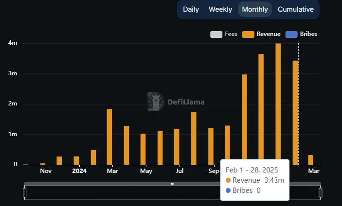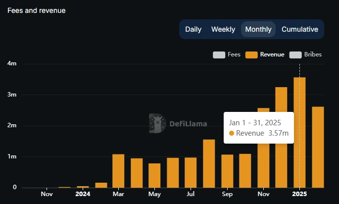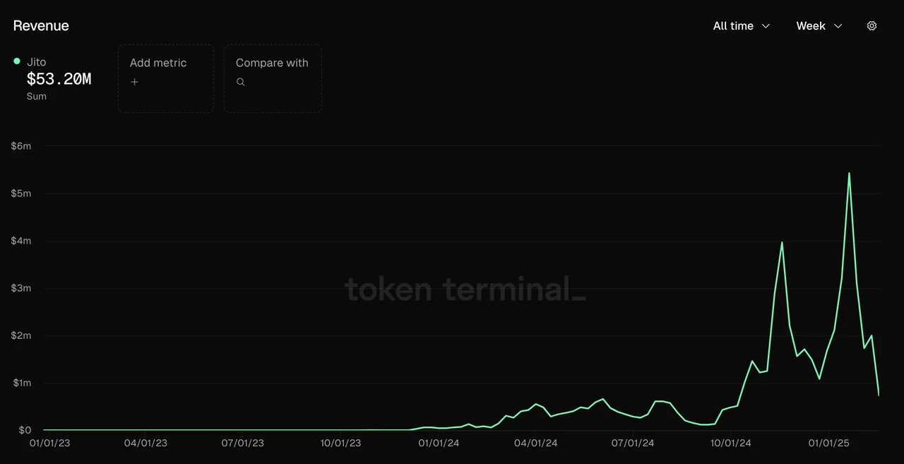 可以看出,Jito 的收入与 Solana 网络热度完全相关,其收入从 24 年 10 月开始比起之前有了数量级的提升,每周收入都超过 100 万美金,而且这部分收入有两个显著高点: 11 月 20 日和 1 月 20 日,当周 Jito 的协议收入分别高达 400 万美金和 540 万美金,对应的也是链上的两个大的投机热潮。不过近期 Solana 链上遇冷之后其收入也迅速下降。