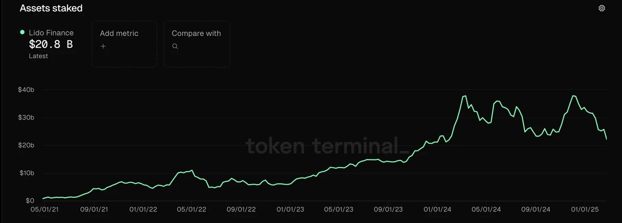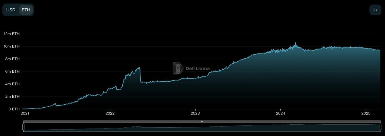 以 ETH 计算的 Lido 质押资产规模 来源: DeFillama