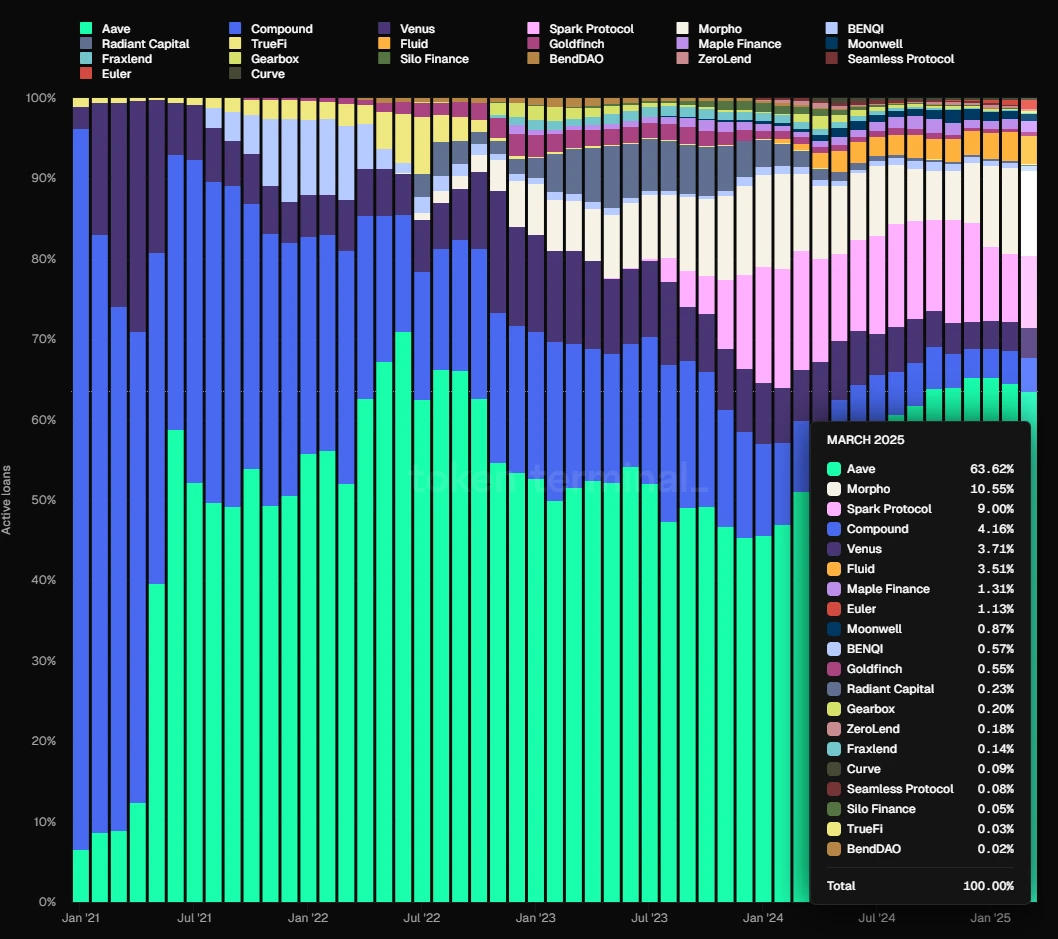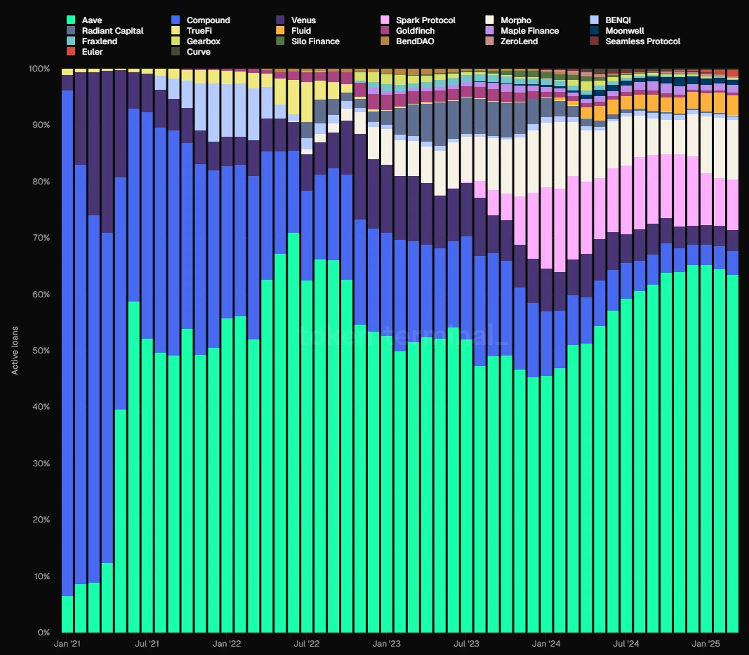 从贷款规模(EVM 链)来看,Aave 的市场占有率一直比较稳定,自 2021 年 6 月之后始终占据市场第一名。在 2023 年下半年,其市场份额一度跌破 50% ,但从 24 年开始重拾升势,目前基本稳定在 65% 左右。