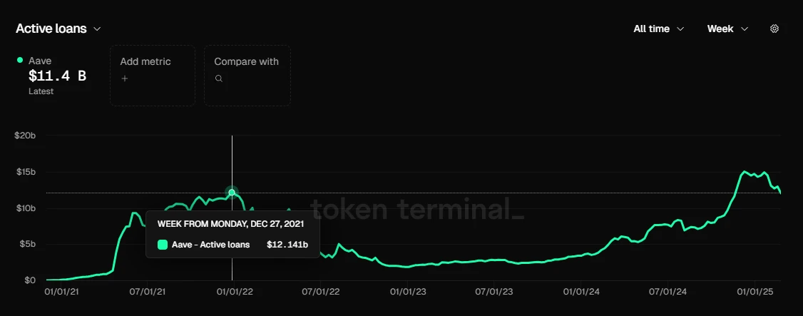 Aave 的贷款规模从去年 11 月以来就超过了上一轮(2021 年 11 月) 121.4 亿的峰值,目前最高峰是 25 年 1 月底时,贷款量为 150.2 亿美金,近来随着市场交易热情趋冷,贷款规模也有所回落,目前约为 114 亿美金。