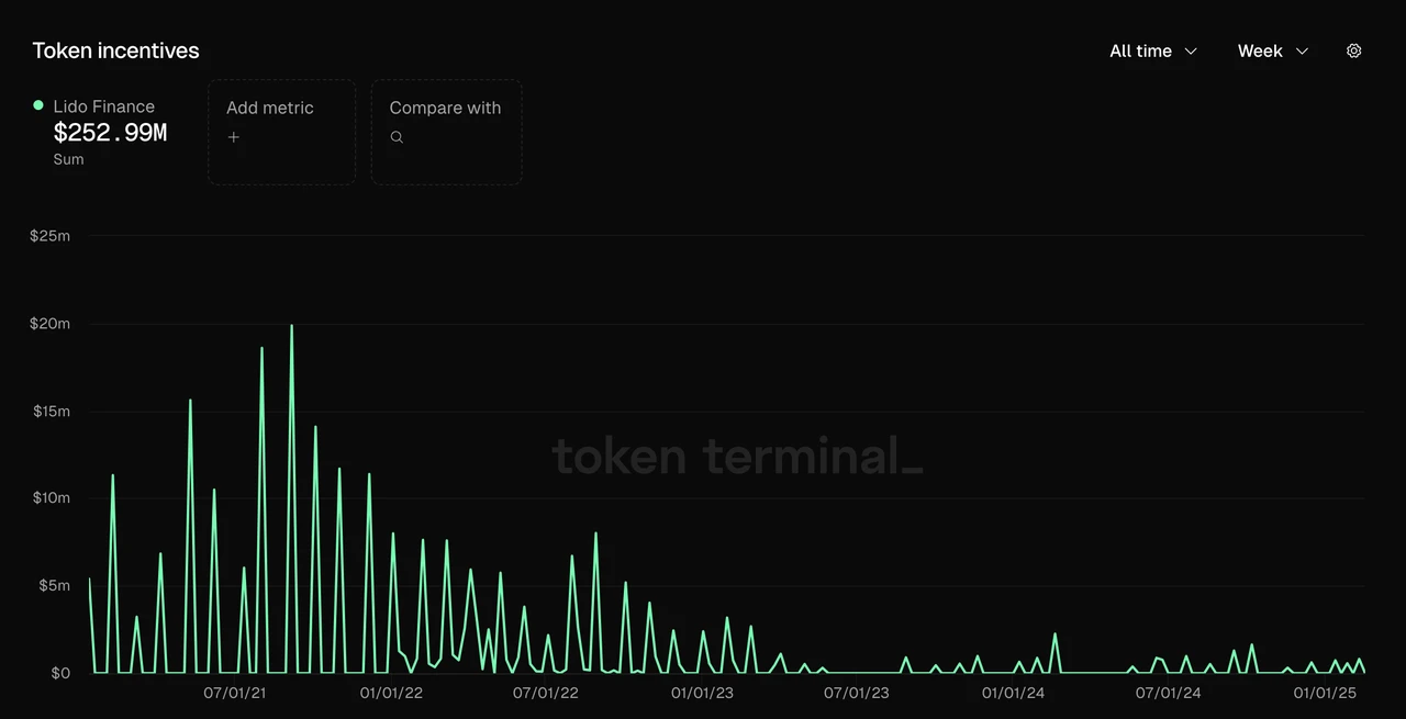 Lido 在协议上线的前两年(2021-2022),花费了巨量的 LDO 代币激励,用于激励其 stETH 与 ETH 的流动性,在两年时间内累计花掉超过 2 亿美元的代币激励,也使得 Lido 在 2021 年 5 月中国禁止 BTC 挖矿、 2022 年 5 月 LUNA 崩盘和 2022 年 11 月 FTX 崩盘等剧烈的市场流动性危机中仍然保证了 ETH 的流动性,获得了目前在以太坊网络流动性质押的领先地位。