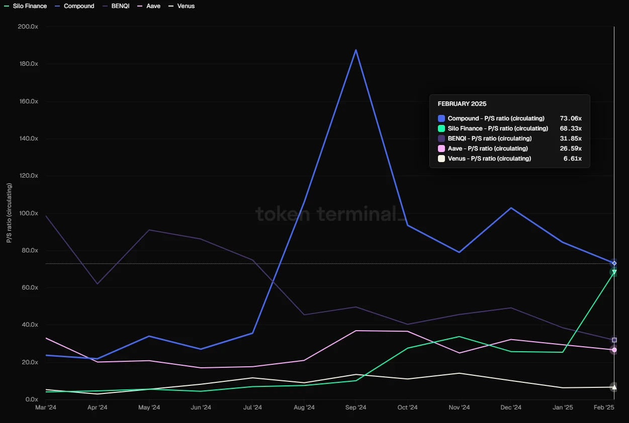 主流借贷协议的 PS(以 FDV 为基准),数据来源:Tokenterminal