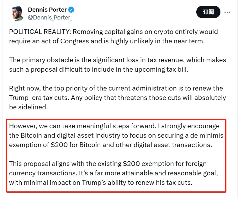 而 Satoshi Action Fund 联创 Dennis Porter 表示完全取消加密税在短期不切实际,但如“最低豁免额”之类的改变是可以争取一下的。