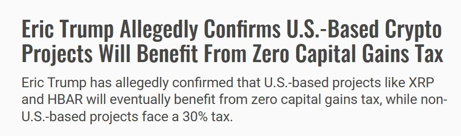 此前就一直有相关消息围绕着对于加密货币税的更改做文章。1 月, The Street 就曾报道热衷于参与加密活动的特朗普之子 Eric Trump 证实如 XRP、HBAR 等美国顶级加密项目将享受零资本利得税的优待,而非美国项目将面临越 30% 的资本利得税。