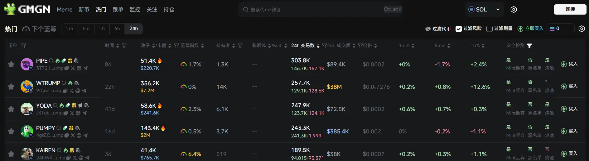 过去 24h Solana 热门代币前五依次为: PIPE、WTRUMP、 YODA、PUMPY、KAIREN