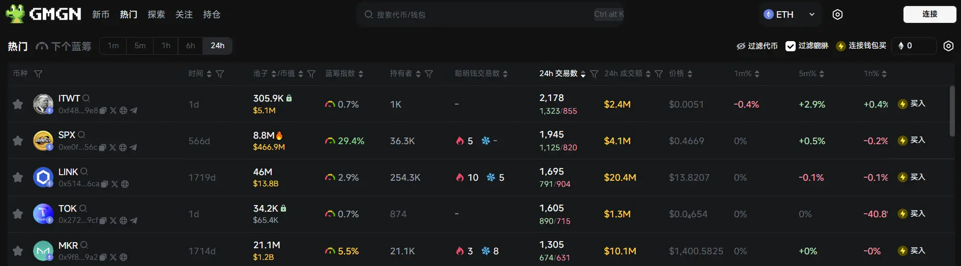 过去 24h 以太坊热门代币前五依次为:ITWT、SPX 、LINK、TOK、MKR