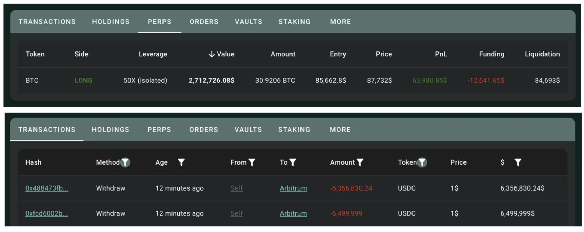 3月2日,在Hyperliquid 上50 倍杠杆做多 BTC 和 ETH 的巨鲸,600万USDC起始,24小时内实现了683万美元的利润。