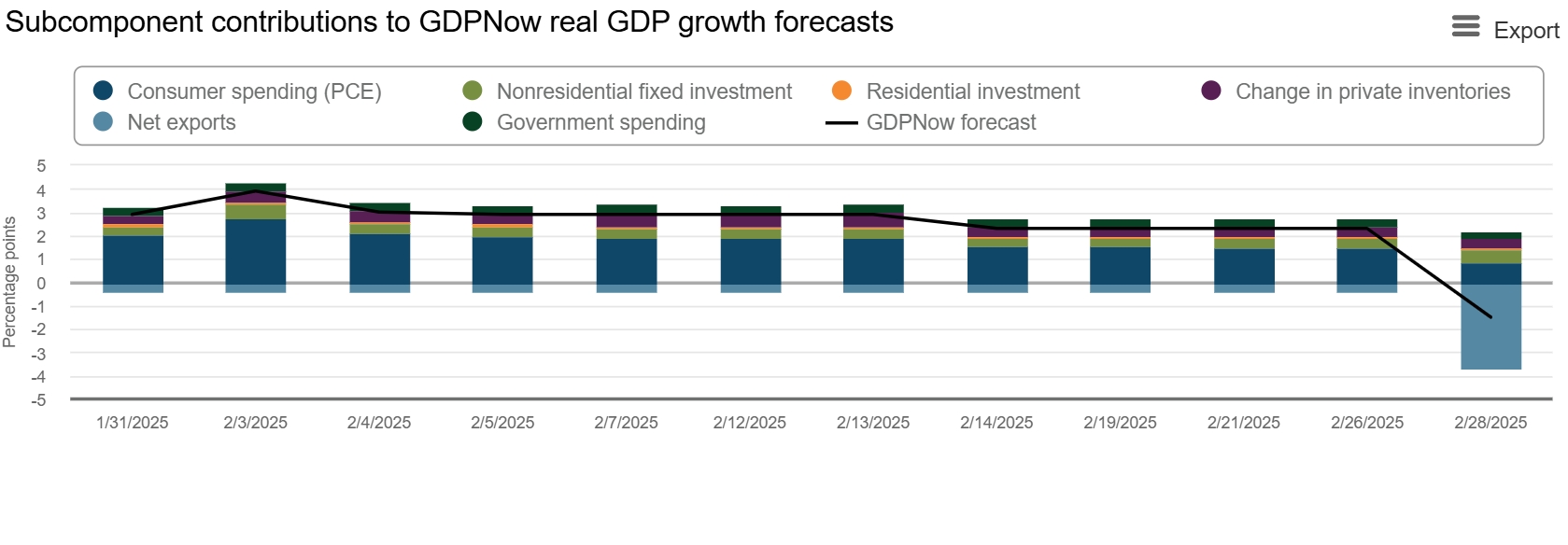 当前,全球宏观经济形势对加密货币市场构成了显著压力。以美国为例,亚特兰大联储的GDPNow模型预测,到2025年第一季度末,美国GDP将收缩2.8%,相比四周前预测的3.9%增长,出现了灾难性的逆转。这种衰退预期让投资者对风险资产的态度趋于谨慎,而加密货币作为高风险资产,自然首当其冲。