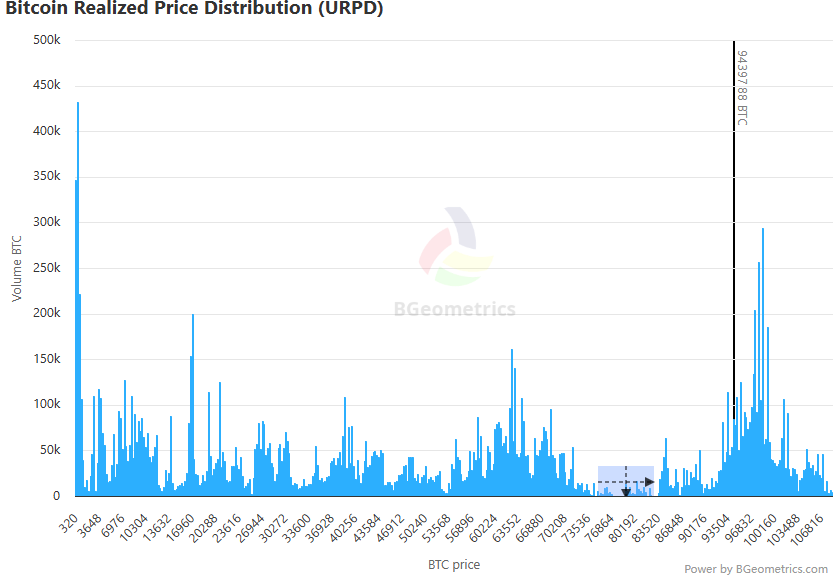 从技术分析的角度看,CME(芝加哥商品交易所)比特币期货缺口的回补是本次下跌的重要触发因素之一。所谓CME缺口,指的是CME比特币期货价格与现货价格之间的差异,通常在周末或节假日后形成。历史数据显示,CME缺口的回补概率超过90%,而URPD(未实现利润/亏损分布)指标也显示,77,000美元附近存在显著缺口。历史上URPD缺口无一不回补。