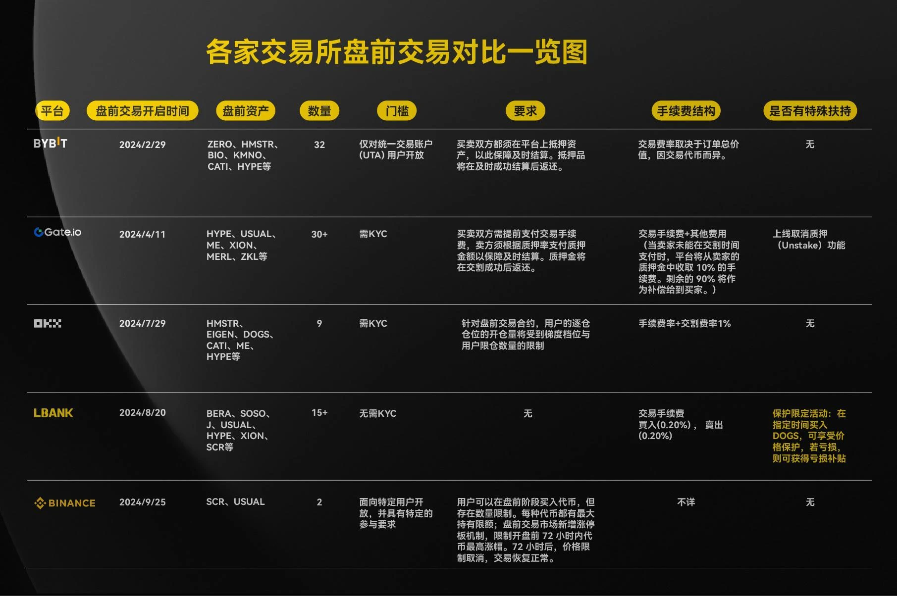 Bybit 是最早布局盘前交易的交易所之一,但其盘前币种较少,选择有限。OKX 则采用了更加专业化的盘前交易模式,提供更丰富的金融工具,套利空间更大,因而更受专业交易者和量化团队的青睐。Binance 在 2024 年底才正式推出盘前交易,并引入涨停板机制。然而,由于上线时间较晚,币种选择极为有限,整体竞争力仍需观察。