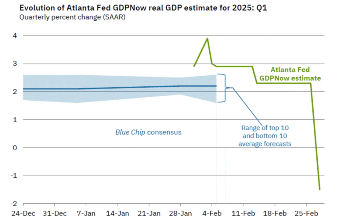 由于亚特兰大联储在上周五公布了最新的 GDP NOW 预测数据,数据罕见的将 2025 年第一季度美国 GDP(季节性调整后)数据的预测为-1.5% 。