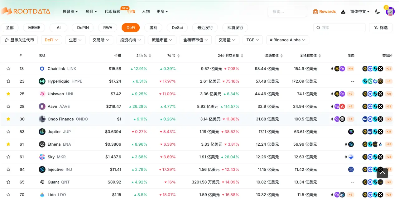 根据 RootData 行情板块,截止发稿,AAVE、LINK、UNI、ONDO 24小时涨幅分别为26.28%、12.91%、9.25%、9.11%。(其中AAVE除了受“DeFi 经纪人规则”废除外,更多可能也是受其回购和新代币计划影响较大。)