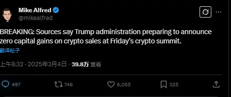 二是Alpine Fox LP 创始人 Mike Alfred 在X平台透露,周五的白宫加密峰会上,特朗普政府或将宣布取消加密货币销售零资本利得税政策。