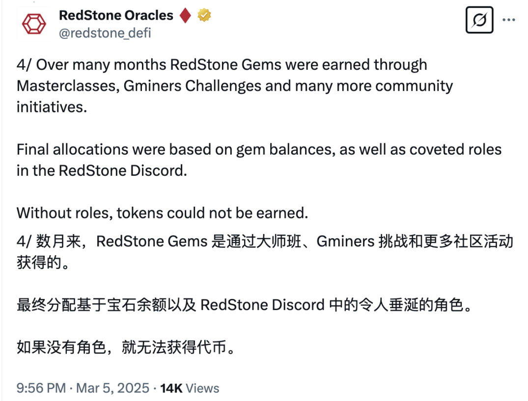 查看其代币经济学, 10 % 的社区空投比例并不算少,不足以说明问题。社交平台上,有社区用户反馈其 参与了多年任务(如 S 1-S 3 赛季的挖矿活动、Zealy 上百个任务、春节活动等),却依旧没有空投。 RedStone 的官方声明中,笔者找到了答案。