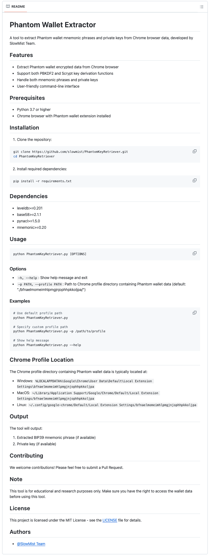 以 PhantomKeyRetriever 工具来说,这是一款专门设计用于从 Chrome 浏览器数据中提取 Phantom 钱包助记词或私钥的脚本,慢雾(SlowMist) 目前已将此工具在GitHub 开源 (https://github.com/slowmist/PhantomKeyRetriever),其核心原理如下: