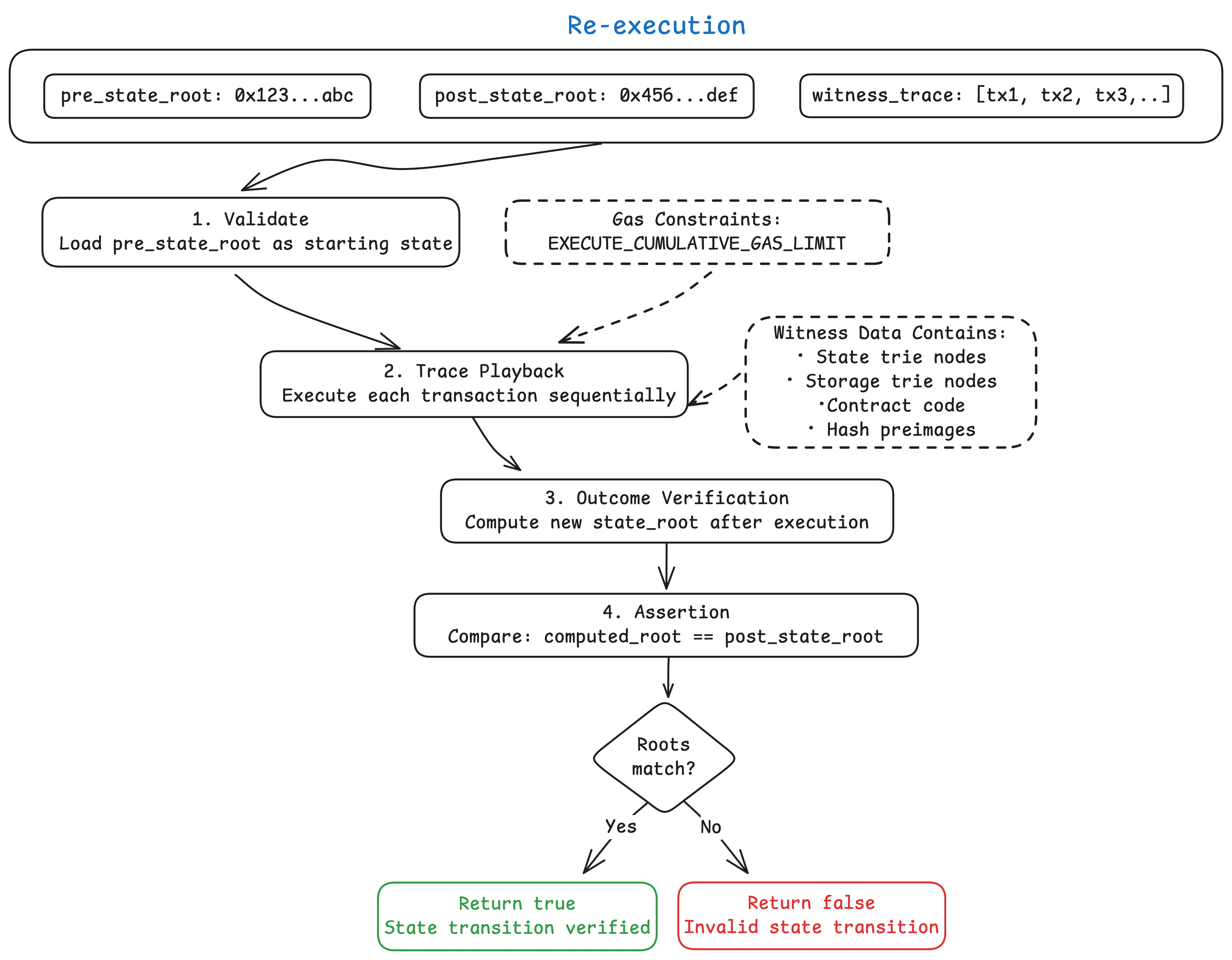 在本地 Rollup 的背景下, 重新执行(Re-execution) 被视为初始实现方案。重新执行指的是 验证者直接执行交易轨迹(transaction trace) ,以验证本地 Rollup 的状态转换是否有效,而不是依赖 SNARK 证明。如果 维持在较小范围内,这种重新执行对于验证者来说仍然是可管理的。