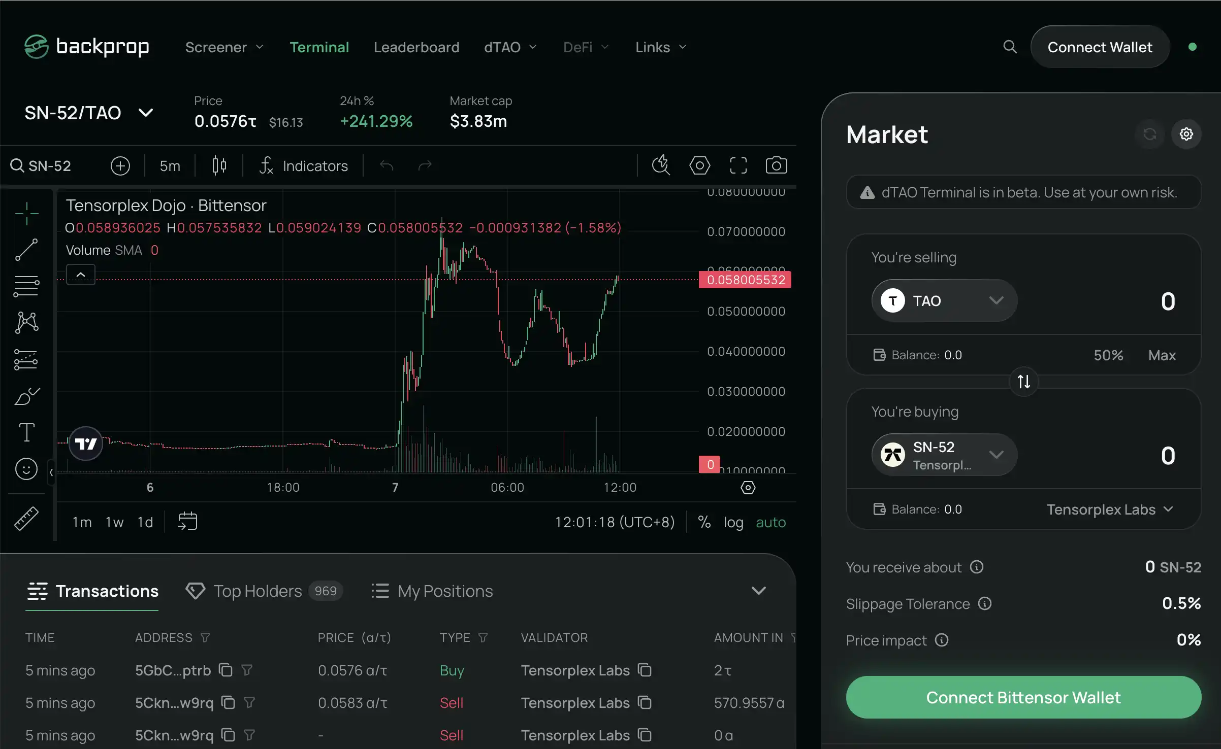 就在上个月,dTAO 正式推出的同时 @BackpropFinance 也正式上线了,在当前这个时间点,作为可以交易 dTAO 的 3 个 Dex 之一「hotkeyswap、taostats」,除了供用户交易各类 Alpha 子网以外,还提供了相当全面的数据看板,将交易看板、地址分析、链上信息查询、市场分析等各类型产品融合在同一个产品中。让人熟悉的 UI 加上完善的数据看板,相当程度的降低了新用户加入 TAO 生态的参与门槛,这也让 Backprop 成为 Bittensor 当前最受欢迎的 Dex 产品。