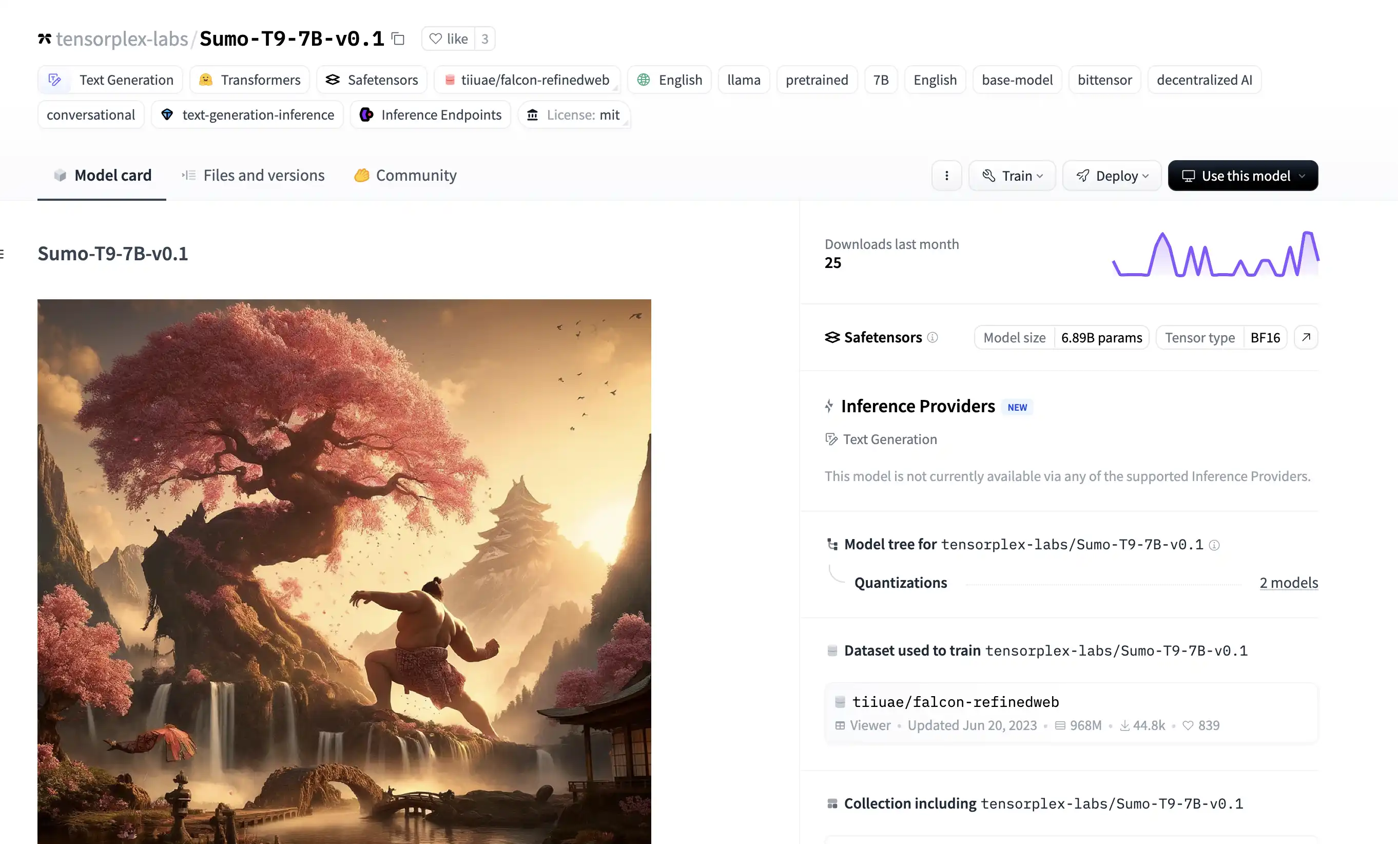 Tensorplex 在大模型中进行了多次尝试,在 @MacrocosmosAI 「Subnet 19 」的去中心化 LLM 预训练竞赛中创建了超越所有开源的同类模型。在 60 多个 Bittensor 子网和 @flock_io 和 @AlloraNetwork 等 AI 链上运行验证器, 2023 年开始就在 Bittensor Subnet 9 上的发布了最新顶级模型 Sumo,而在 2024 年 4 月将参数上限提高到 70 亿后,Sumo-T 9-7 B 的表现甚至优于 Falcon 7 B、Llama 2 7 B 等知名模型。