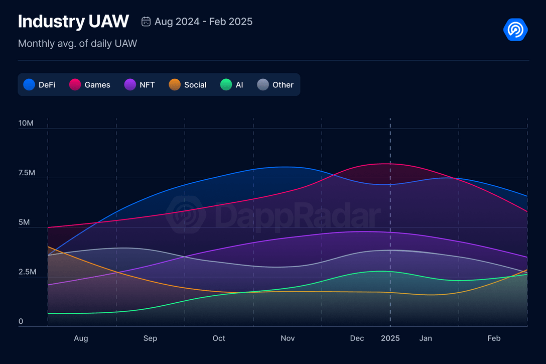 尽管整体活跃度有所下降,但 DeFi 仍占主导地位,用户份额最大。 2 月约有 27% 的活跃钱包与 DeFi 应用有关,巩固了其作为最常用 dapp 类别的地位。然而,并非所有领域都遵循了下降趋势,社交、NFT 和 AI 均出现增长,表明用户兴趣在不断变化。