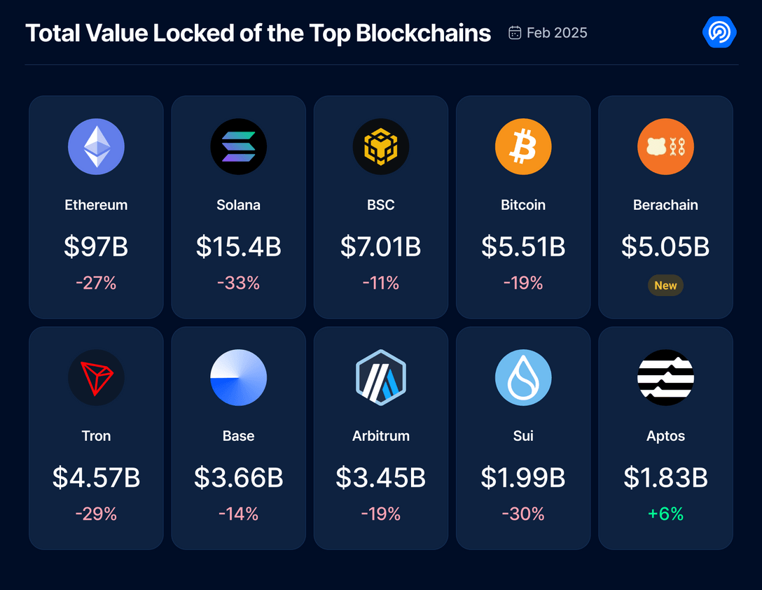 2 月份 DeFi 领域遭遇急剧下滑,TVL 从 2170 亿美元暴跌至 1680 亿美元。这一下滑反映了更广泛的市场波动、资本外流和流动性变化,这些都影响了主流和新兴的 DeFi 生态。