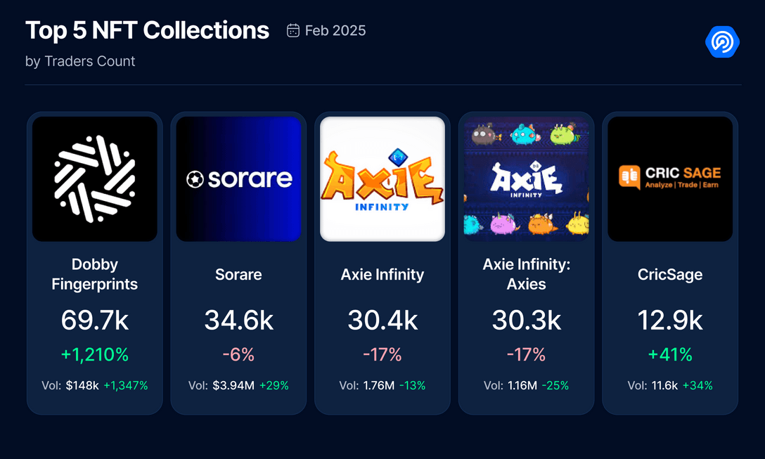 2 月份,Web3 趋势发生了转变,尽管整体活动略有下降,但 AI、游戏和社交 dapp 仍在增长。DeFi 面临急剧下滑,尽管 AI 驱动和体育类 NFT 势头强劲,但整体 NFT 交易量下降。当月还创下了加密黑客攻击的记录,凸显了加强安全措施的必要性。