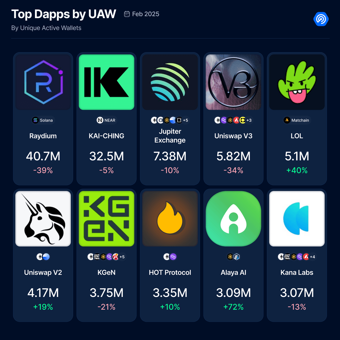 继 1 月份的强劲上涨之后,2 月份 Dapp 活动略有降温。据估计,所有跟踪的 dapp 的日独立活跃钱包(dUAW)总数下降 8%,稳定在 2400 万左右。
