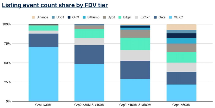 Bybit、KuCoin、Bitget 和 Gate 等中型交易所在四个 FDV 层级上币量更为均衡,其中 3000 万至 5 亿美元的份额略大。MEXC 采取了不同的策略,重点关注 FDV ≤ 3000 万美元的代币,占此类别上币活动的 70%。