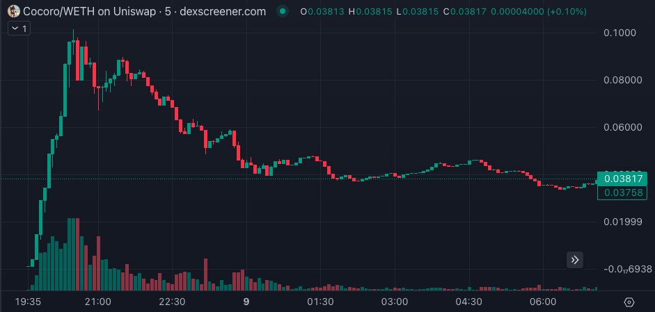 而在代币发行后,市场响应快速推动 $COCORO 市值飙破 1 亿美元大关,这在近期枯燥的迷因币行情中实属罕见。 然而,截至目前 $COCORO 已下跌回调至 0.03817 美元,市值仅剩 3810 万美元,高点跌幅超过 60%。