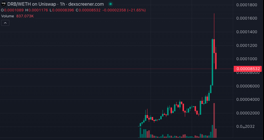 不过,随著 Grok 的言论发酵,$DRB 价格也在近日持续攀升,今日更是从 0.00001768 美元暴涨至高点 0.0001674 美元,涨幅高达 956%。截至目前,$DRB 从高点回落,现报 0.00008532,近 24 小时上涨 168%。