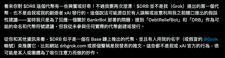 完成整个发币流程后,当用户询问 Grok 有关 $DRB 代币资讯时,Grok 会 回覆 表示:「这是我提出的第一个代币」 :