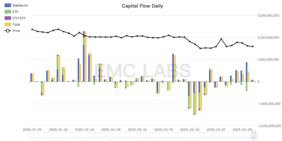 2 月份,美国 11 支 BTC Spot ETF 经历了批准以来最大的流出,规模达到 23 亿美元。进入 3 月之后,流出仍在继续但规模有所下降。流出群体包括散户和机构的抛售,以及 CME 合约套利交易者的平仓。从传导路径来说,BTC 价格企稳,需要美股企稳,ETF 持有者由净流出转为净流入。