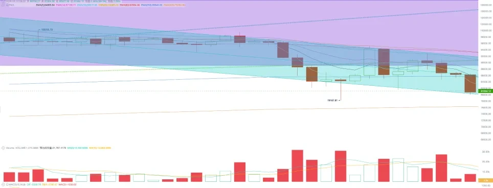 本周 BTC 开于 94265.47 美元,收于 80699.17 美元,全周暴跌 14.39% ,振幅 15.29% ,成交量较上周有所下降,仍保持高位。BTC 价格跌破“特朗普底”(89000 ~ 110000 美元箱体),大幅回撤“特朗普交易”涨幅。