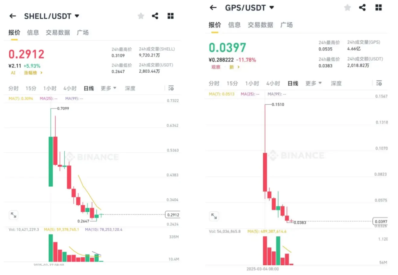 GPS 上线交易所后 20 分钟跌破开盘价,价格从 0.15 美元高点暴跌 74% 。SHELL 从 0.7 美元一路跌至 0.26 美元。GPS、SHELL 两代币拥有几乎复刻式的价格走势图,仿佛被同一只无形的手操控。