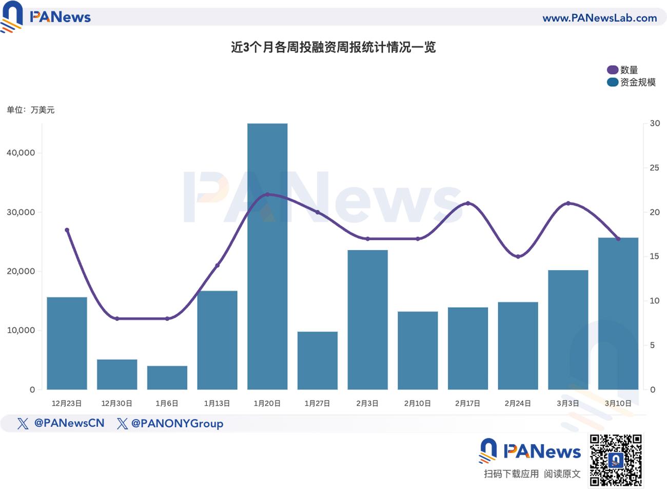 据 PANews 不完全统计,上周(3.3-3.9)全球区块链有17起投融资事件;资金总规模超2.57亿美元,与前一周相比有所增多,概览如下: