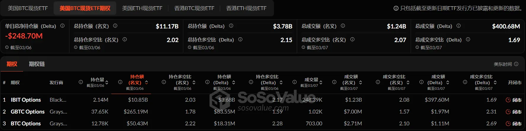 截至 3 月 7 日,美国比特币现货 ETF 期权名义总成交额为 12.4 亿美元,名义总成交多空比为 2.07。