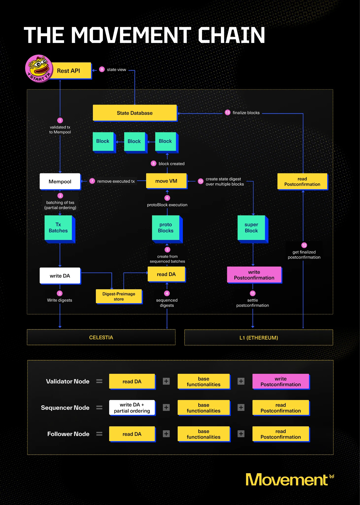 Movement 的主节点对交易进行批处理、存储,并提供部分交易排序。随后,Celestia 协助完成 Movement 的最终交易排序。未来,Movement 的交易将通过去中心化的排序器进行排序。