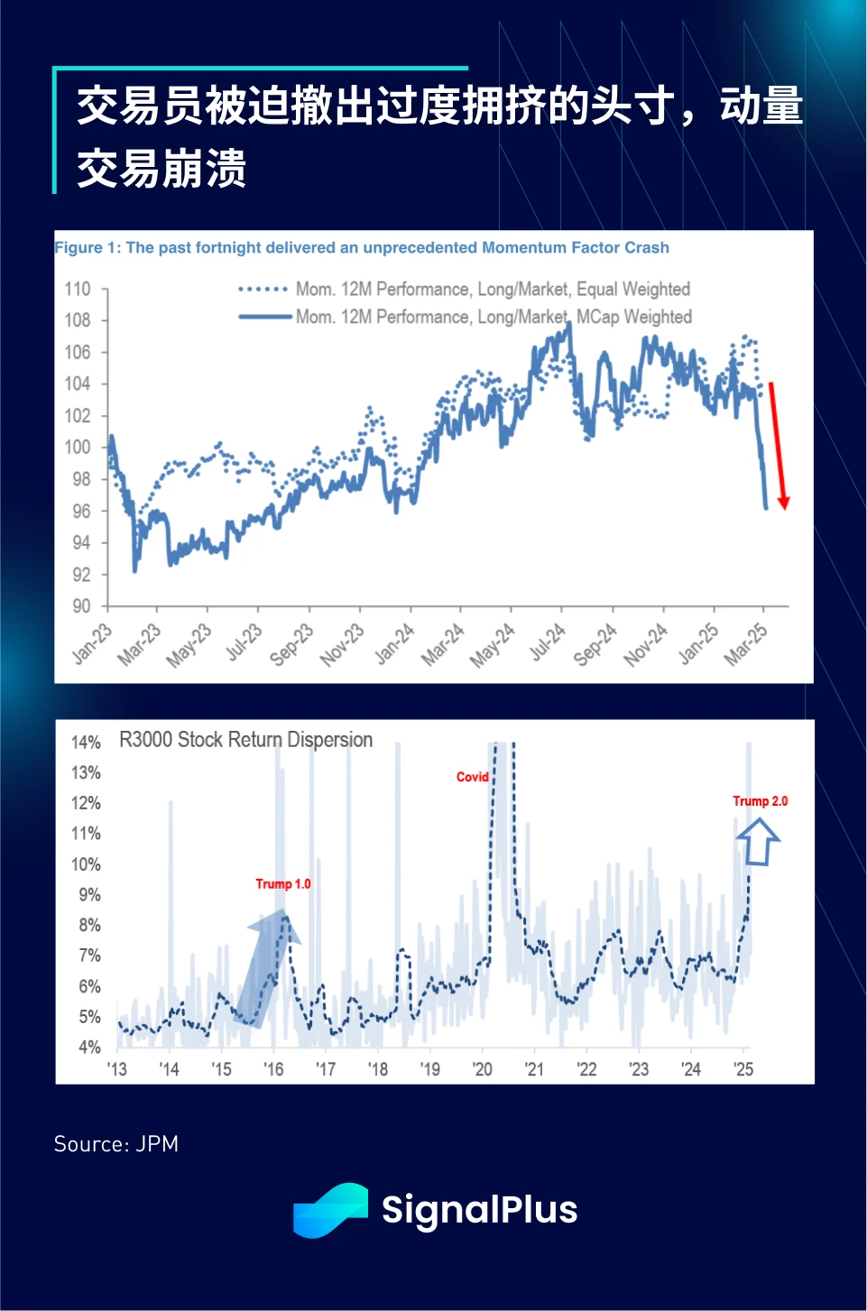 作为回应,美国投资者迅速撤出拥挤的动量交易,广泛的清算和系统性策略去杠杆引发快速的因子崩溃(factor collapse),股票回报离散度也跃升至疫情以来的最高水平,而跨资产投资组合因经济增长放缓、关税不确定性以及欧洲财政政策的重大转向而遭受自 2023 年以来的最大损失。