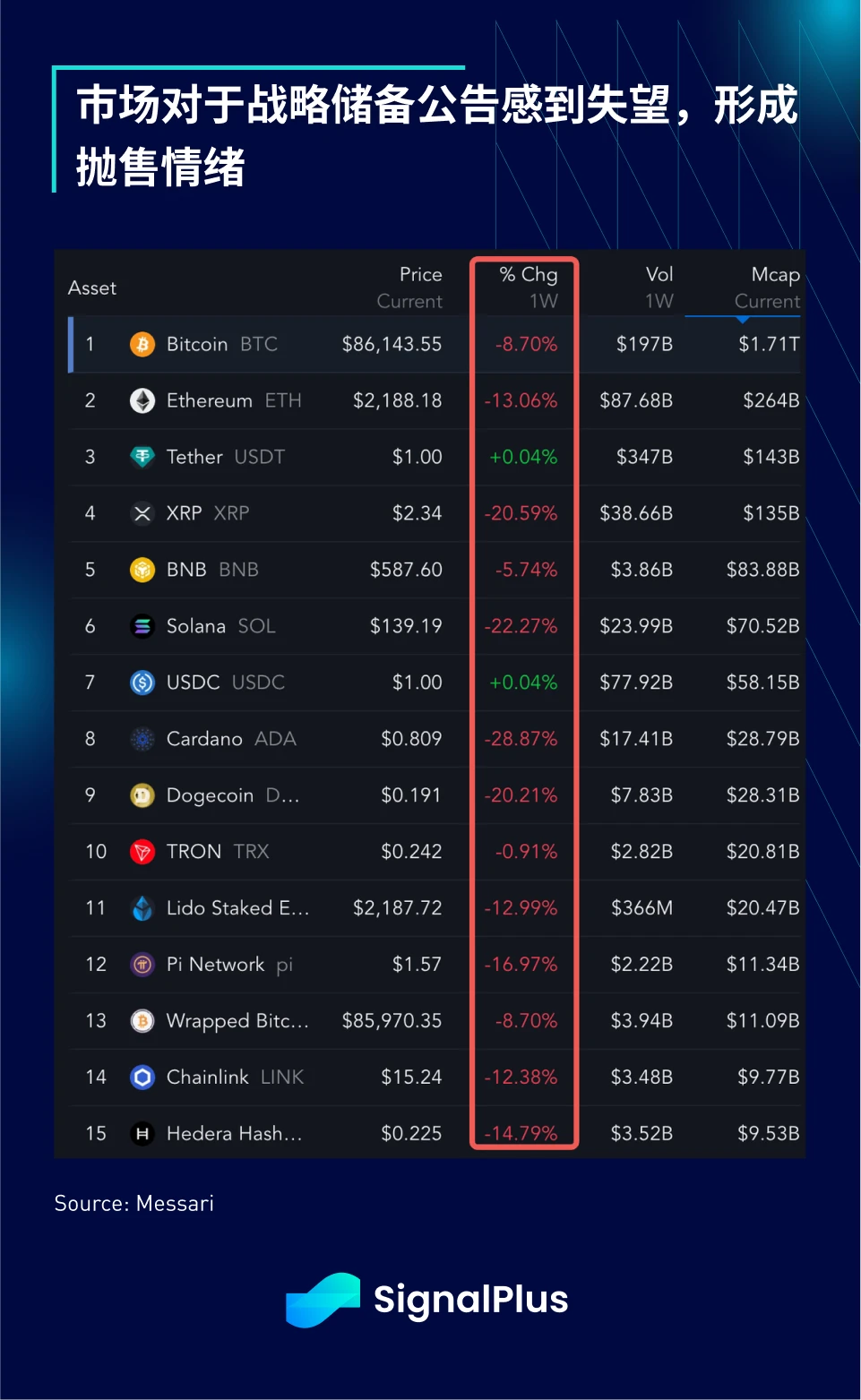 加密货币资产经历了震荡的一周,最终以失望告终。先前的加密货币战略储备声明以及备受关注的白宫加密货币峰会并没有带来任何实质的购买计划。