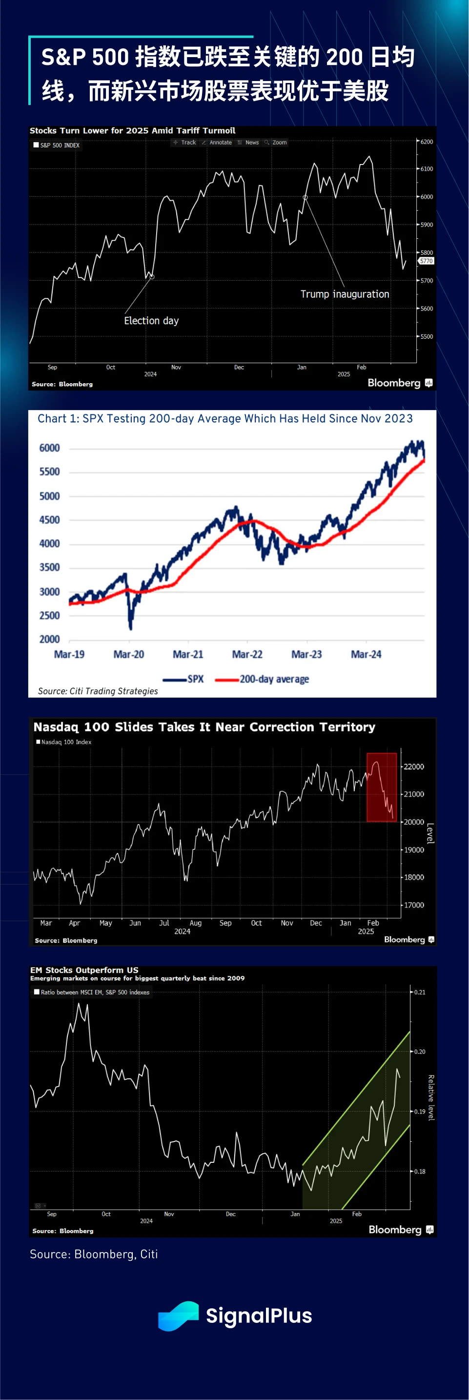 自 2 月中旬触及年初至今高点以来,MSCI World index 已下跌 4.6% ,SPX 下跌超过 6% ,目前正接近 2023 年底以来一直保持的 200 日均线。科技股主导的 Nasdaq 指数下跌近 10% ,Nvidia 跌幅近 20% ,而新兴市场股票的表现则大幅超越美股,创下十年来最大优势,这是否意味著美国市场的超卓表现即将终结?