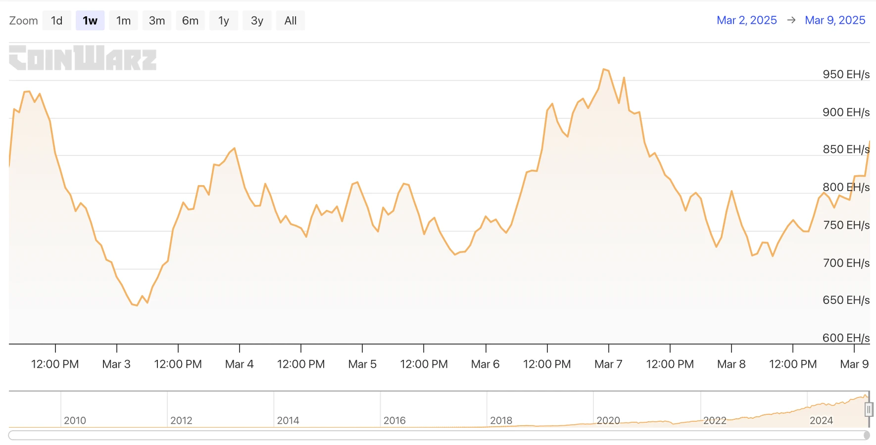 在 2025 年 3 月 3 日至 3 月 9 日期间,比特币网络哈希率呈现显著波动,反映出矿工算力的动态调整及市场环境的影响。3 月 3 日,哈希率大幅攀升,从 650.51 EH/s 跃升至 859.31 EH/s。随后在 3 月 4 日出现震荡回落,最低降至 741.64 EH/s,但很快回升至 814.15 EH/s,表现出一定的短期波动性。3 月 5 日,算力进一步波动,先降至 748.62 EH/s,随后回升至 812.17 EH/s,但又再次下探至 717.95 EH/s,表明矿工行为仍在调整。3 月 6 日,比特币网络算力进入快速增长阶段,哈希率依次攀升至 768.85 EH/s、 918.33 EH/s,并最终触及 964.16 EH/s,创下本周期高点。然而, 3 月 7 日,网络算力出现回调,哈希率回落至 728.29 EH/s,随后短暂回升至 802.39 EH/s。3 月 8 日,哈希率再度下探至 716.83 EH/s,但随即进入新一轮上升趋势。截至 3 月 9 日,哈希率持续攀升,最新数据已达到 868.36 EH/s,表明矿工算力正逐步恢复至较高水平。