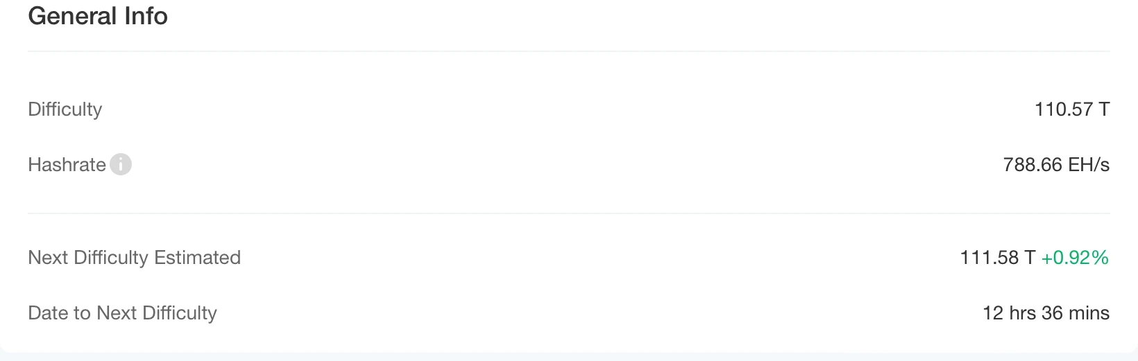 据 CloverPool 数据,截至 2025 年 3 月 9 日,全网算力约为 788.66 EH/s,挖矿难度为 110.57 T。截至撰稿时,预计下次比特币挖矿难度将在 12 小时后上调 1.29% 至 111.58 T(此前预测为 0.92% )。随着难度调整的发生,矿工的运营效率也随之优化,从而影响整体能源消耗。